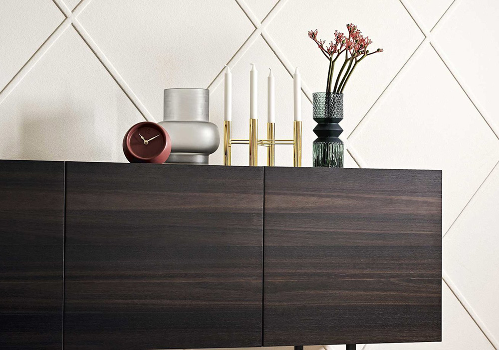 buffet modèle HORIZON avec 3 portes et la structure en bois. La porte centrale, sans poignée, présente un système d’ouverture à poussoir (push-pull). Tous les compartiments ont une étagère intérieure en verre trempé transparent. HORIZON est enrichi d’un plateau supérieur en verre ou en céramique et d’une base élégante en métal à section rectangulaire. HORIZON est un buffet de grande dimension, parfait pour un espace repas/séjour spacieux et raffiné.
