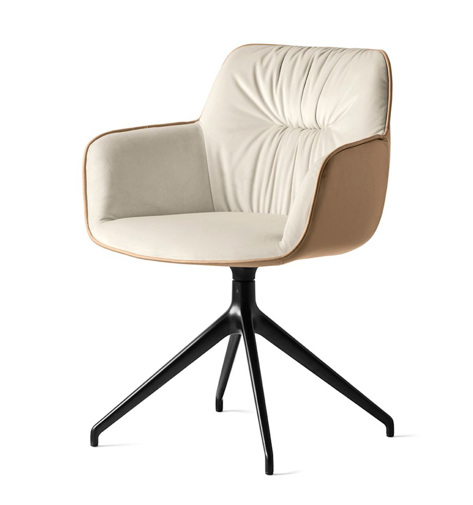 La chaise COCOON est né dans le but précis de créer un modèle qui reprenne les formes des chaises des années 60, mais avec des lignes plus modernes et actuelles, avec des sections et des épaisseurs généreuses pour rendre l’assise confortable et accueillante. Les finitions dans des tissus souples et plissés mettent d’autant plus en valeur l’effet doux et enveloppant au style légèrement rétro. Chaise réalisée avec une monocoque enveloppante en mousse de polyuréthane moulée à froid à basse densité. Cette version est dotée d’une structure pivotante à branches en aluminium et d’un mécanisme de retour.