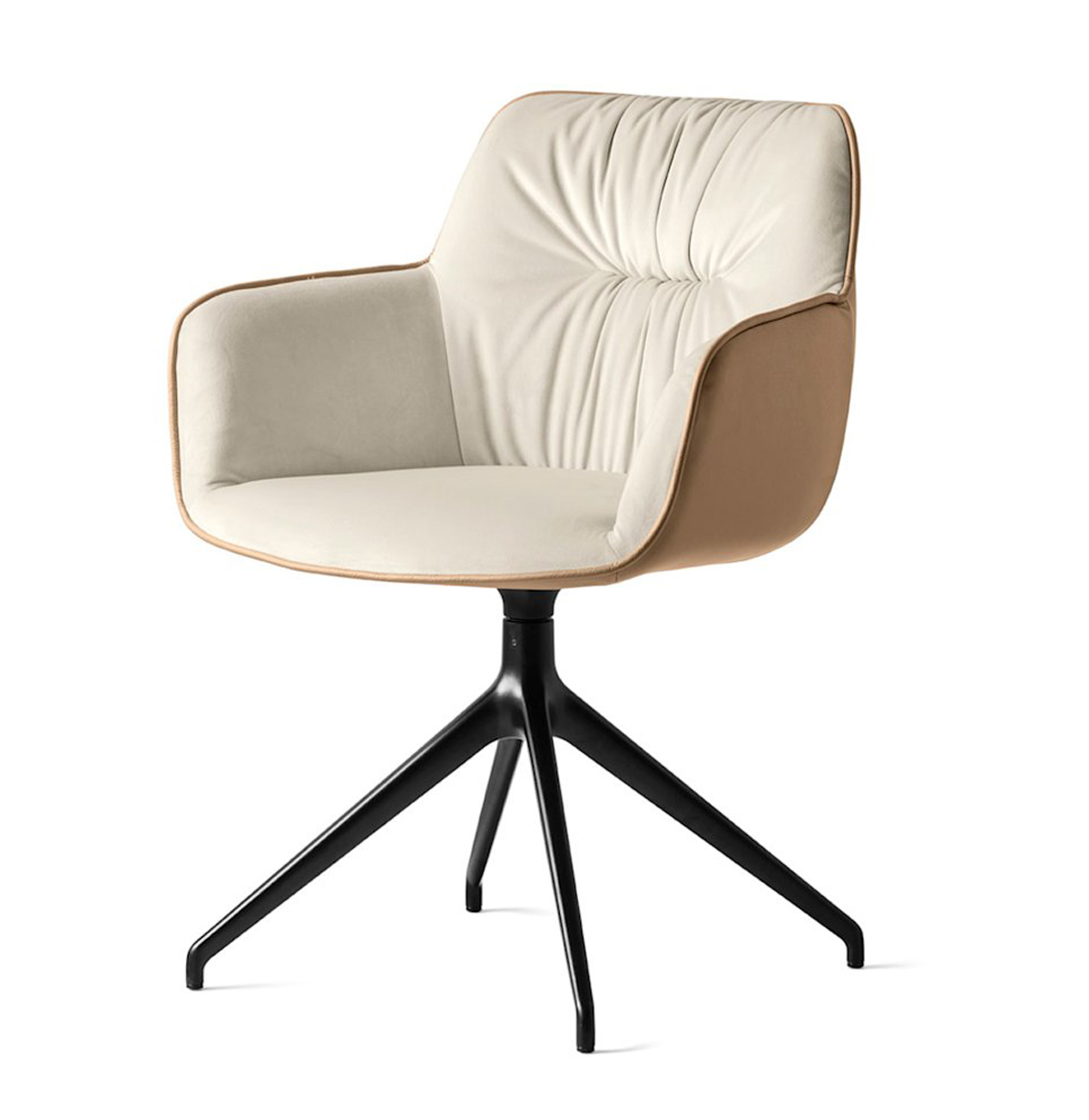 La chaise COCOON est né dans le but précis de créer un modèle qui reprenne les formes des chaises des années 60, mais avec des lignes plus modernes et actuelles, avec des sections et des épaisseurs généreuses pour rendre l’assise confortable et accueillante. Les finitions dans des tissus souples et plissés mettent d’autant plus en valeur l’effet doux et enveloppant au style légèrement rétro. Fauteuil réalisé avec une monocoque enveloppante en mousse de polyuréthane moulée à froid à basse densité. Parfaite pour le bureau, cette version est dotée d’une structure pivotante à branches en aluminium et d’un mécanisme de retour.