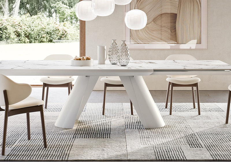 La table Apian aux proportions élégantes est l’expression d'une approche conceptuelle attentive à l’architecture du projet et à sa réalisation avec des matériaux soigneusement travaillés.Son aspect léger s’inspire du thème d’une feuille de métal qui se courbe et s’incline, en dessinant le piètement qui se distingue par une forme nette et bien marquée sur laquelle s’appuie le plateau à rallonges qui, grâce à son mécanisme breveté, atteint jusqu’à 3 mètres de longueur. La bande périphérique du plateau reprend le ton de la structure de la base qui révèle le détail de la double feuille de métal vernie, créant un jeu de lumières fascinant et illuminant une zone normalement dans l’ombre. Apian a toutes les caractéristiques nécessaires pour constituer un véritable élément de surprise dans un projet de décoration d'intérieur.