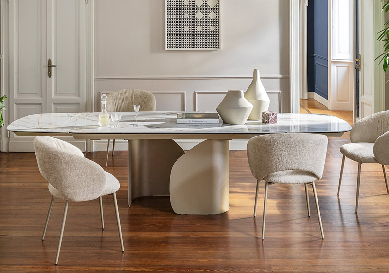 Twins est une table au grand impact visuel grâce à sa base, composée de deux éléments en tôle courbés et moulés qui, comme deux ailes, font voler visuellement le plateau. De nombreuses finitions sont disponibles, permettant d'interpréter la table de manière classique ou moderne.