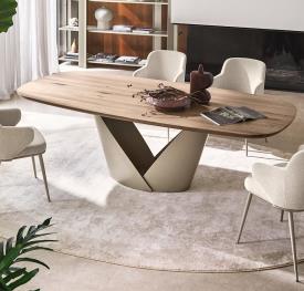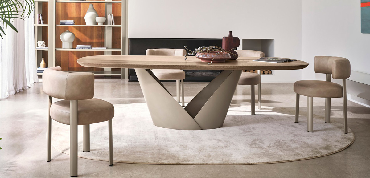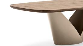 Une table importante, conçue pour être le protagoniste du salon contemporain. Calla se distingue par sa base qui rappelle une fleur : solide mais en même temps légère, elle est constituée de deux lames de métal qui s'emboîtent comme des pétales, créant une forme de calice qui s'ouvre vers le haut, suggérant vitalité et renaissance.