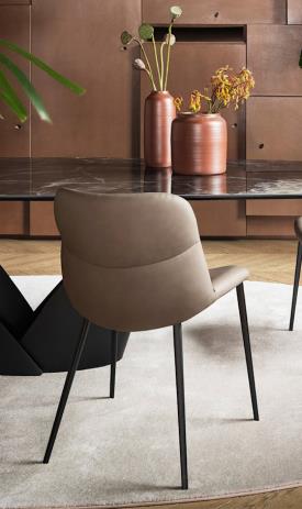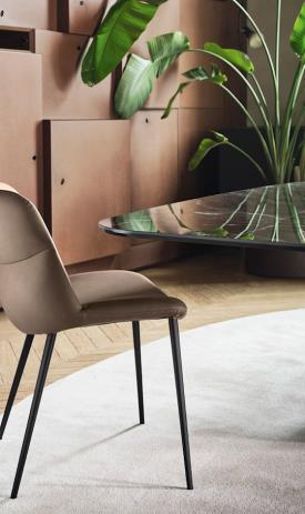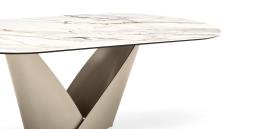 Une table importante, conçue pour être le protagoniste du salon contemporain. Calla se distingue par sa base qui rappelle une fleur : solide mais en même temps légère, elle est constituée de deux lames de métal qui s'emboîtent comme des pétales, créant une forme de calice qui s'ouvre vers le haut, suggérant vitalité et renaissance.