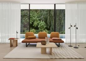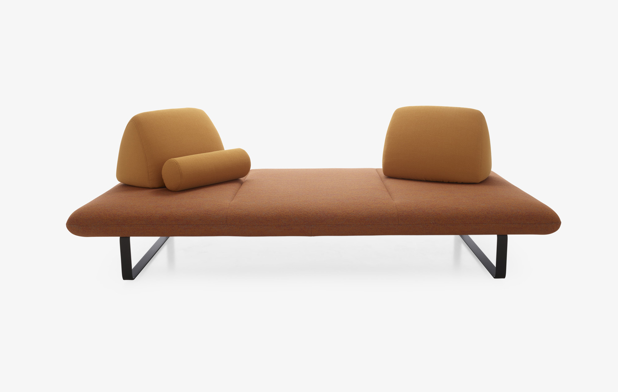 Le Murtoli conçu pour l’outdoor rentre à l’intérieur, ce qui confirme la perméabilité des espaces : In gets out (cf Ottoman), et Out gets in (cf Murtoli). Une grande plateforme 240 x 120, suspendue par des lattes en fibres de verre et de mousse Bultex, monté sur un piétement acier noir mat (traité anticorrosion), recouvert d’une housse déperlante. Les coussins de dos sont tout en mousse et lestés par une plaque en bois (indoor) de 15mm afin de donner une surface d’appui au matériau antiglisse. Ces coussins de dos permettent donc de trouver la position idéale, en les déplaçant sur la plateforme. Le canapé est tarifé avec 2 coussins de dos et un traversin. Il peut également se traiter en bicolore et/ou en bi matière.