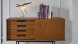 Dessinée par Pierre Guariche en 1953, cette lampe à poser aux lignes intrigantes est proposée en noir. Élégante, délicate et sculpturale, elle éclaire à merveille un bureau, une console ou une table de chevet. Détails des matériaux : La lampe est équipée d’un réflecteur en acier laqué noir, avec la structure et le piètement en laiton vernis brossé avec l’ampoule fournie. Structure et pieds laiton brossé vernis satin, cache lampe acier laqué blanc, abat-jour acier laqué noir face extérieure, laqué blanc sur la face intérieure ; interrupteur sur le cache lampe. Livré avec une ampoule Led filament 8W E27 2700 K.