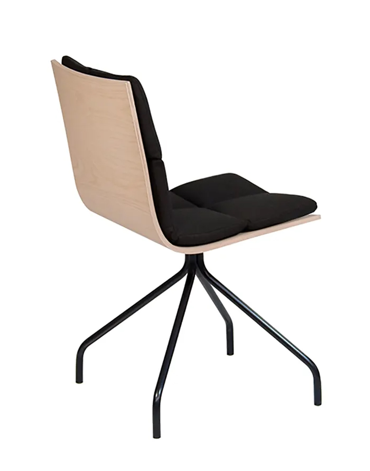 chaise avec dossier bas, coque en bois et coussin tissu. Pied central en métal.