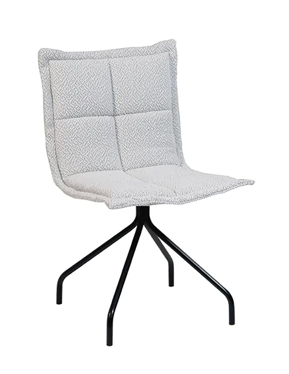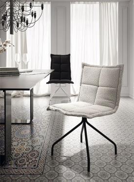 chaise avec dossier bas, coque complète en tissu. Pied central en métal.