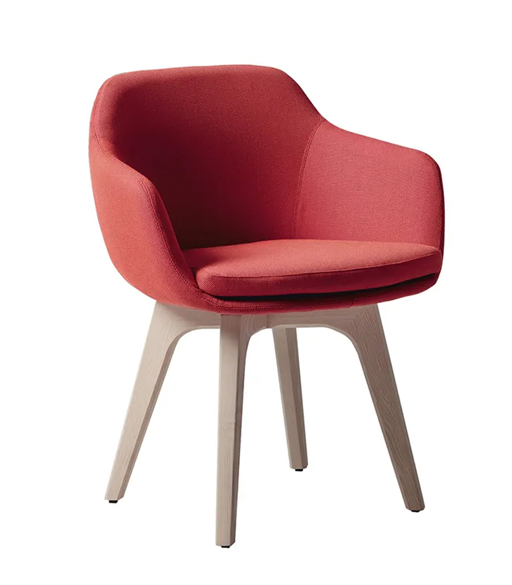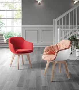 Chaise avec base en bois massif de hêtre ou de frêne et coque complète en tissu et coussin déhoussable.