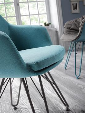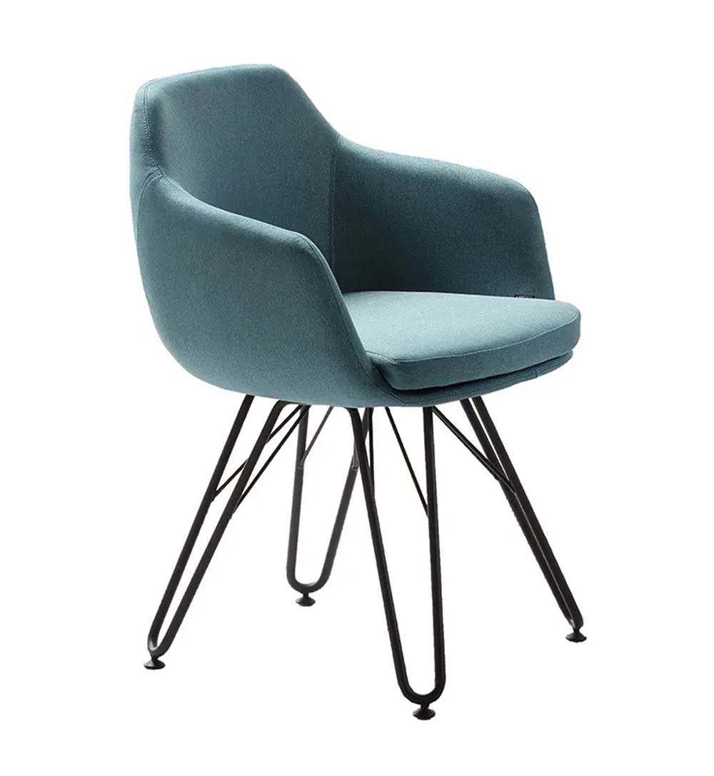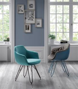 Chaise avec base métallique en tube de Ø14 mm et coque complète en tissu et coussin déhoussable.