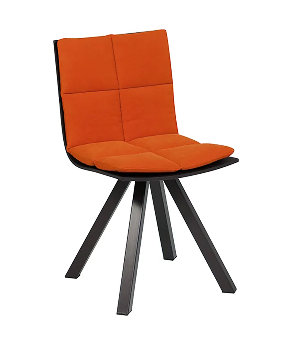 Chaise avec dossier bas, coque en bois et coussin tissu. Pied central en métal.