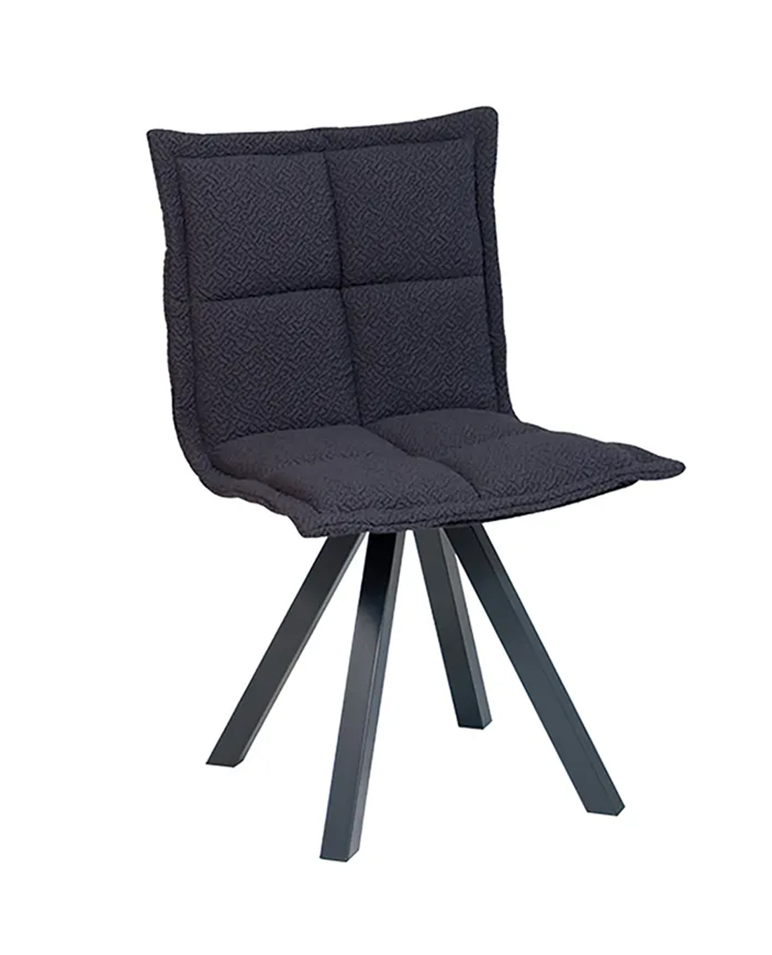 Chaise avec dossier bas, coque complète en tissu. Pied central en métal.