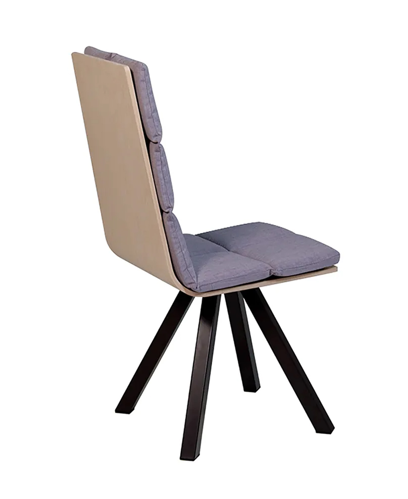Chaise avec dossier haut, coque en bois et coussin tissu. Pied central en métal.