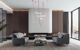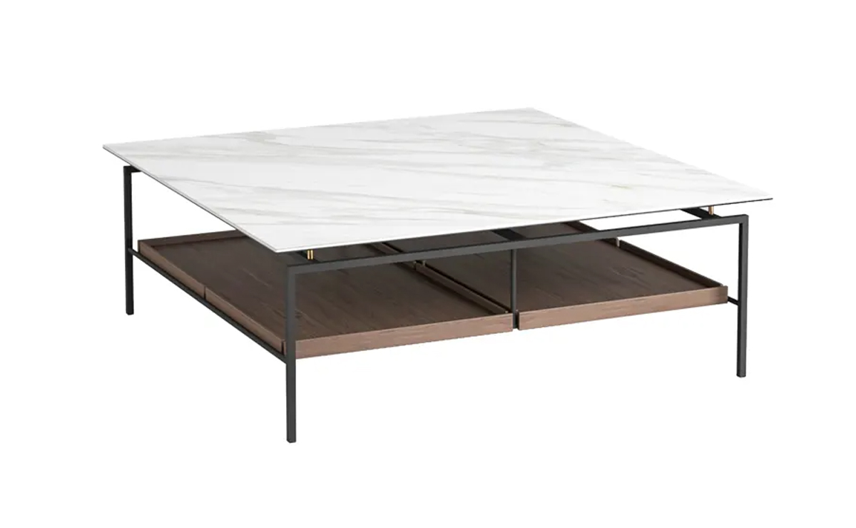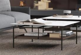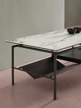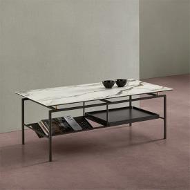 Table basse avec plateau en céramique et hauteur de 43 cm. Peut être complété par des plateaux en bois et/ou en métal.