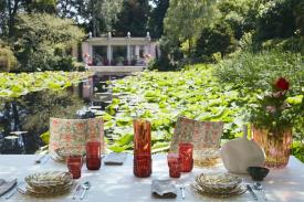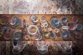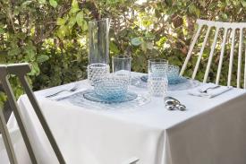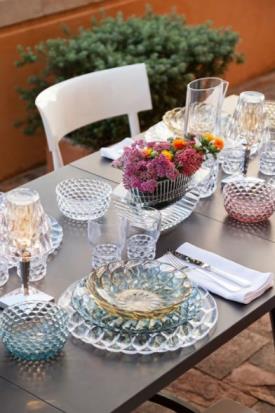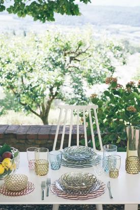 Une riche gamme d’assiettes, de plateaux, de verres, de bols, de carafes, de tasses à café et sucriers. La particularité de cette collection vient du fait que chaque modèle présente un motif différent s'inspirant aux moules qui servaient autrefois à faire les gélatines. Les superpositions des assiettes et les assortiments de couleurs créent un ensemble extroverti mais discret, à la fois créatif et sophistiqué.