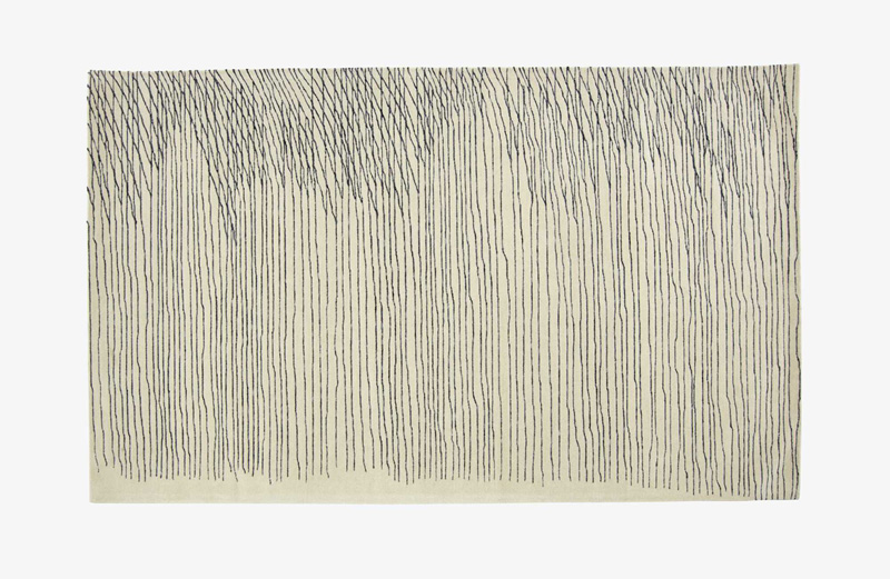 Tout le travail de François Azambourg tend vers l’épure, la simplicité et la légèreté. Son tapis Tracé illustre bien cette approche : le motif dessiné semble avoir à peine effleuré la surface du tapis, comme un griffonnage machinal déposé à la pointe du crayon. L’effet de légèreté graphique est renforcé par le contraste entre la brillance discrète de la viscose du motif réalisé en micro-bouclettes et la sobriété du fond tufté rasé en laine de Nouvelle-Zélande. Tapis fond tufté rasé coloris écru, motif bouclettes coloris gris. 70 % laine Nouvelle-Zélande – 30 % viscose.