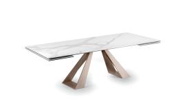 Table repas extensible avec plateau et rallonges en verre . base et rails en métal laqué. équipée d’un mécanisme breveté très à l’aise qui permet aux rallonges de s’étendre et de prolonger la surface de cm 80. disponible aussi avec plateaux en céramique.