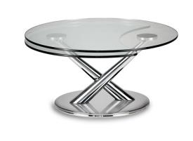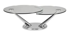Table de salon extensible avec plateaux tournants synchronisés en verre. piétement et supports en acier laqué ou galvanisé. la base est équipée d’un mécanisme de rotation synchronisée qui permet une ample modulation de la forme. disponible aussi avec plateaux en céramique.