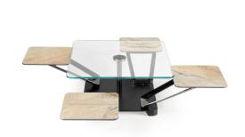 Table de salon extensible avec 5 plateaux en verre ou céramique. équipée d’un mécanisme synchronisé qui permet l’ouverture simultanée des 4 plateaux. Supports en acier laqué ou chromé.