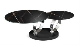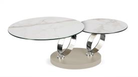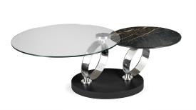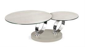 Design Y. Hatano Dimensions : l 80/128 x h 43 x p 80 cm table de salon extensible avec plateaux tournants synchronises en verre. Piètement en bois, supports en acier laqué ou galvanisé.