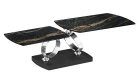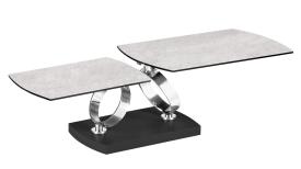 Design Y. Hatano Dimensions : l 88/154 x h 43 x p 55 cm Table de salon extensible avec plateaux tournants-synchronisés en verre. piètement en bois, supports en acier laqué ou galvanisé. table de salon extensible