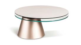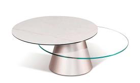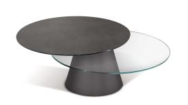 Table de salon extensible avec plateaux tournants en synchronie. Socle en acier laqué, plateau supérieur en céramique, inférieur en verre ou céramique.