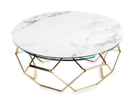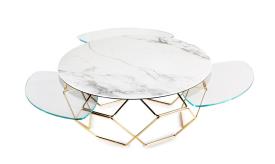 Table de salon avec plateaux en céramique et verre, base en acier. Laquée ou traitée au bain galvanique, équipée d’un mécanisme novateur qui, par la seule rotation du plateau supérieur permet l’ouverture des 3 tablettes inférieures. Disponible aussi sans mécanisme.