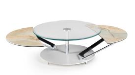 Table de salon extensible avec 3 plateaux en verre ou céramique. Equipée d’un mécanisme synchronisé, qui permet l’ouverture simultanée des 2 plateaux. Supports en acier laqué ou chromé.