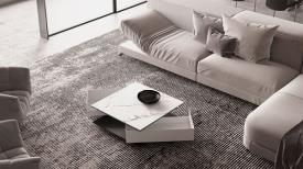 Table de salon carrée avec plateaux disponibles dans toutes les finitions céramique ou en verre. base et tiroirs disponibles en finition laquée, équipée d’un mécanisme pour l’ouverture synchronisée des 2 tiroirs.