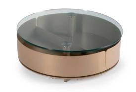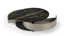 Table de salon ronde avec plateaux disponibles dans toutes les finitions céramique ou en verre. base et tiroirs disponibles en finition laquée, équipée d’un mécanisme pour l’ouverture synchronisée des 2 tiroirs.