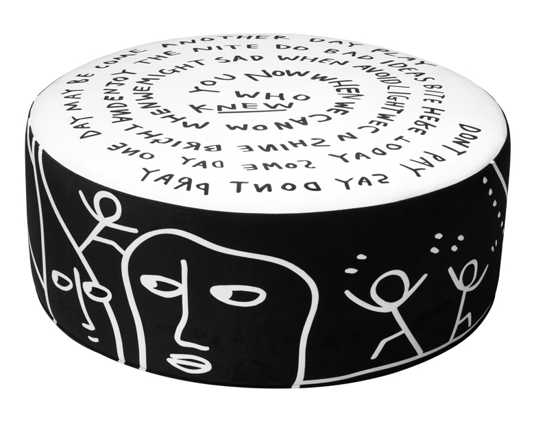 Le pouf Dawn Pouf L est le grand pouf de la collection Linescapes, une série de poufs, coussins caractérisés par des lignes, des textes et des dessins stylisés en noir et blanc, un langage visuel récurrent dans l'œuvre de Shantell.