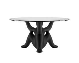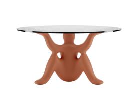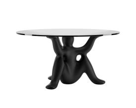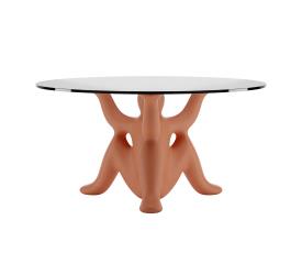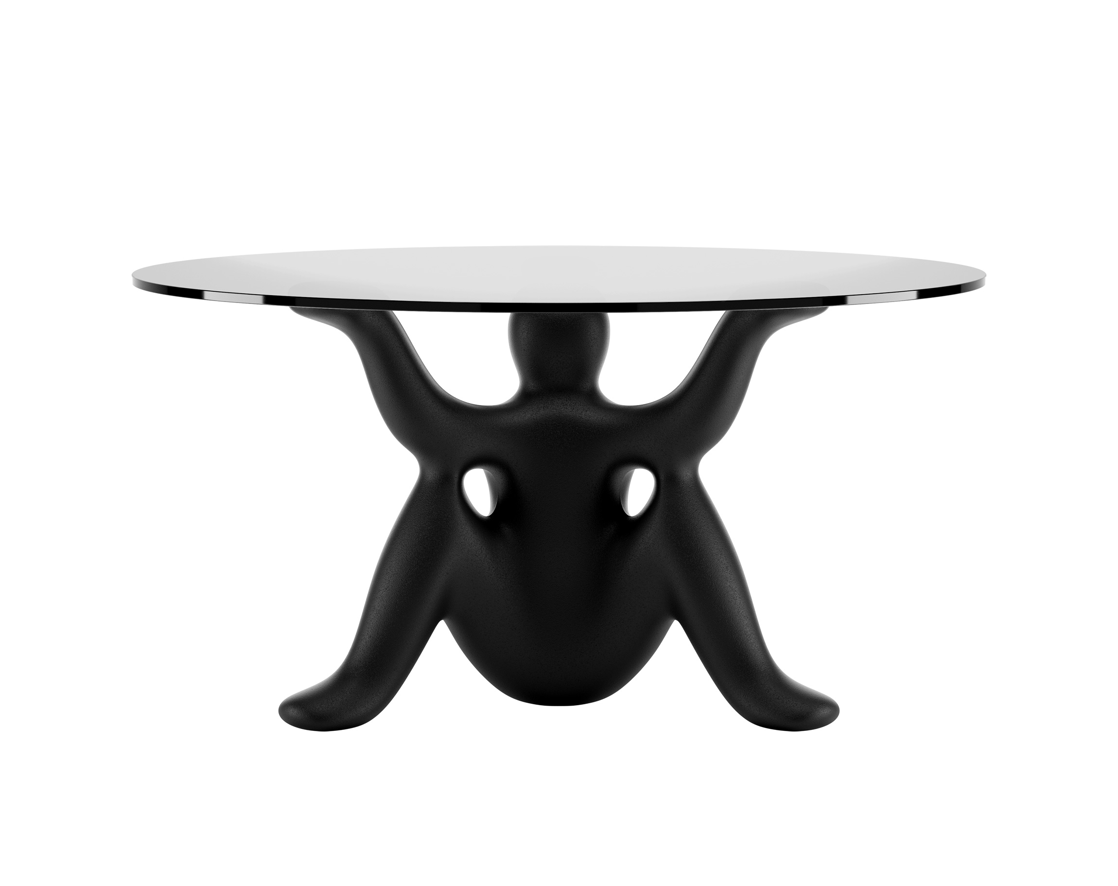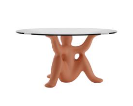Ces génies à trois jambes et trois bras constituent la base d'un plateau en verre de 140 cm de diamètre.